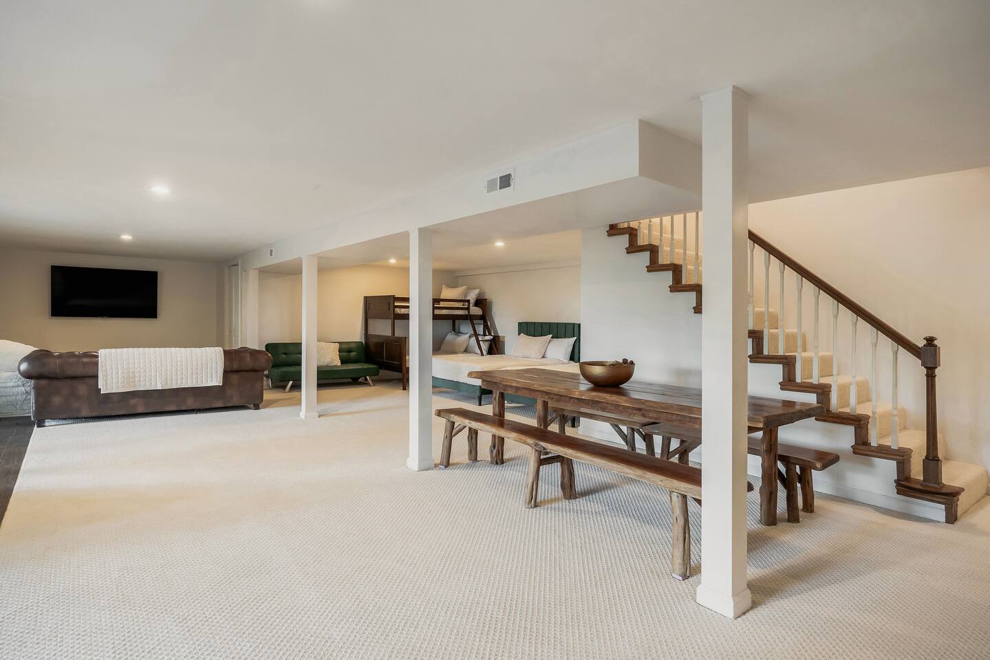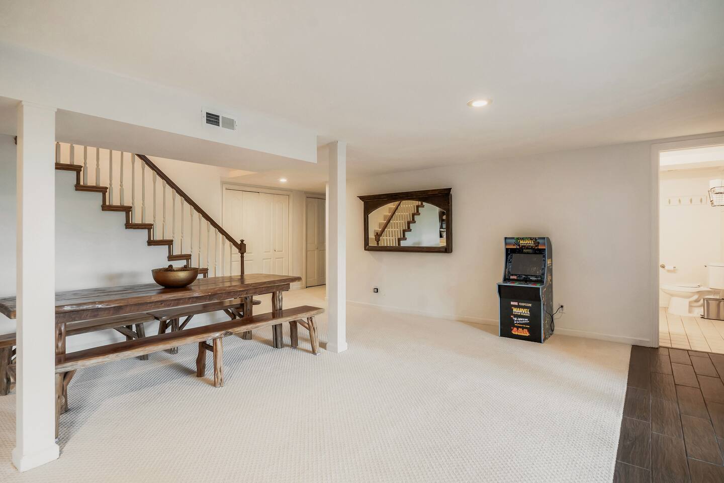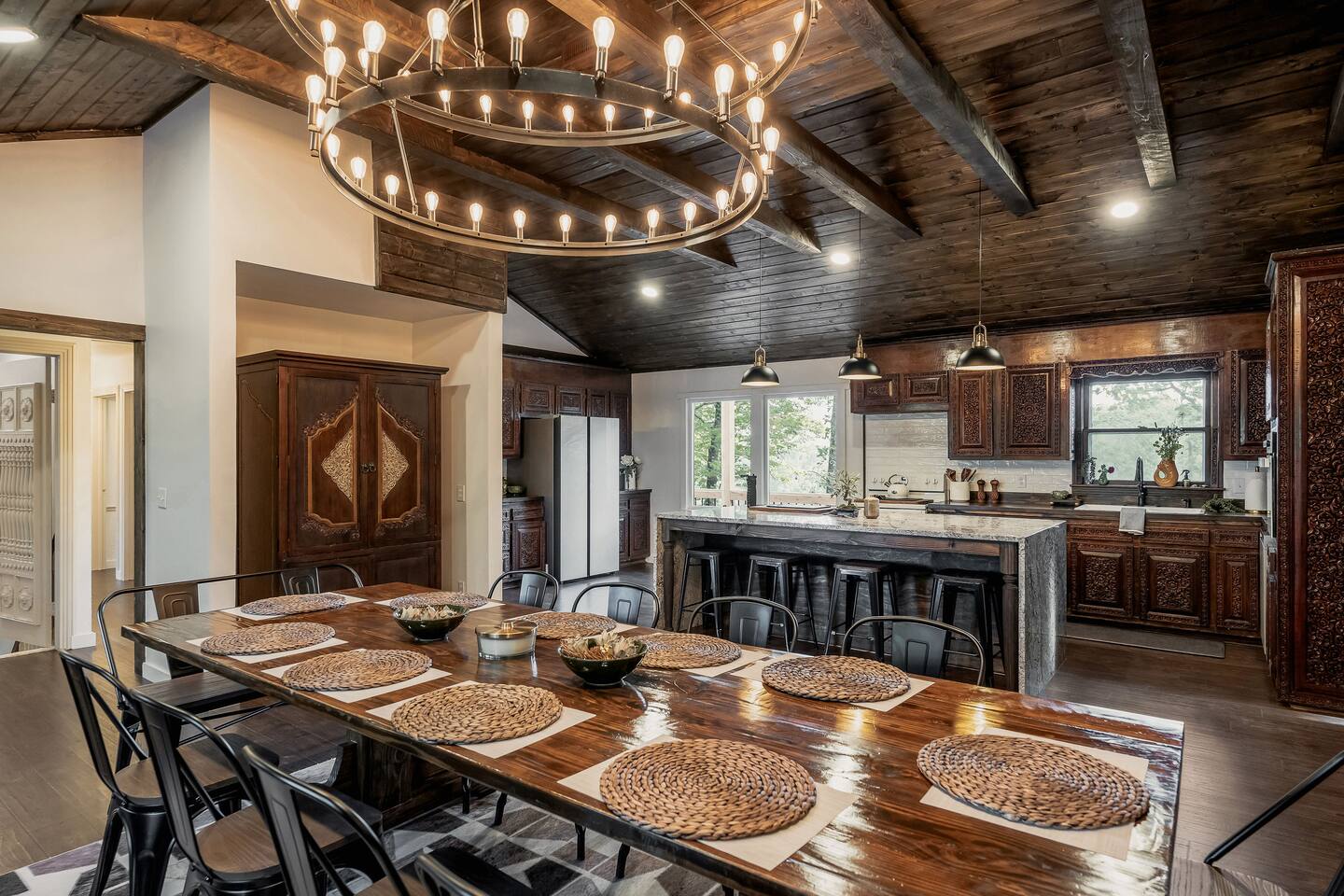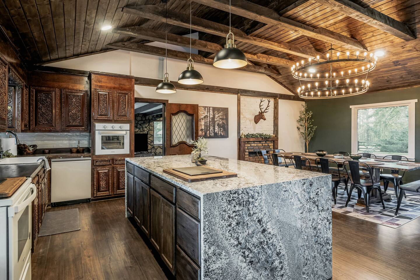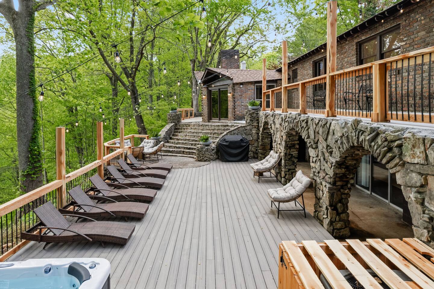 This 7 bedroom 4 bathroom with lower-level rec room is perfect for hosting any size group! The kitchen and lounge areas are a vintage, hip and cozy style!. The outdoor space is spacious and very unique featuring a hot tub, sauna , deck, fire pit, BBQ, and games.
