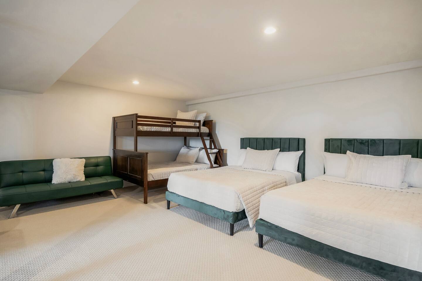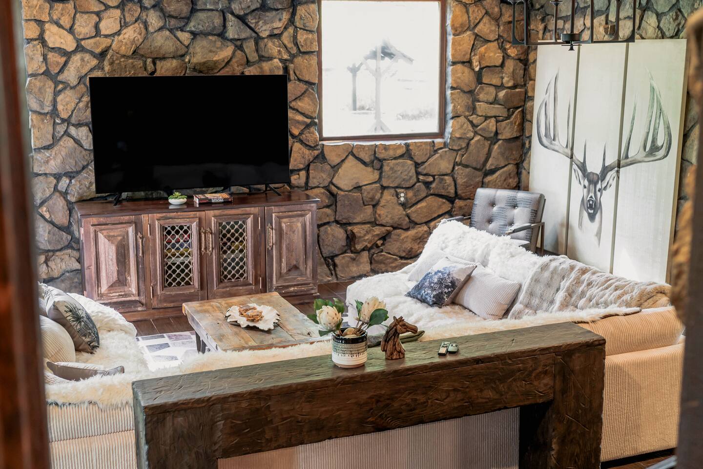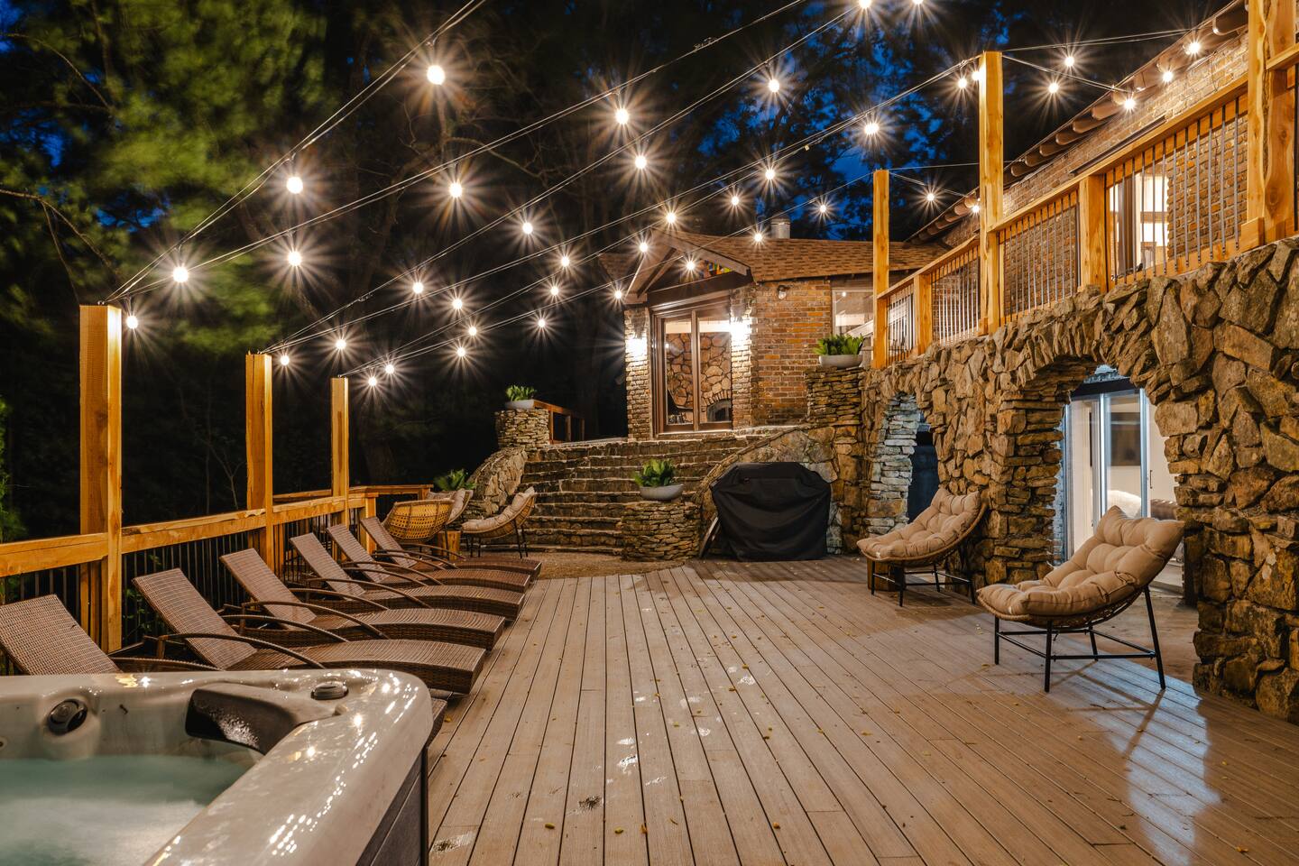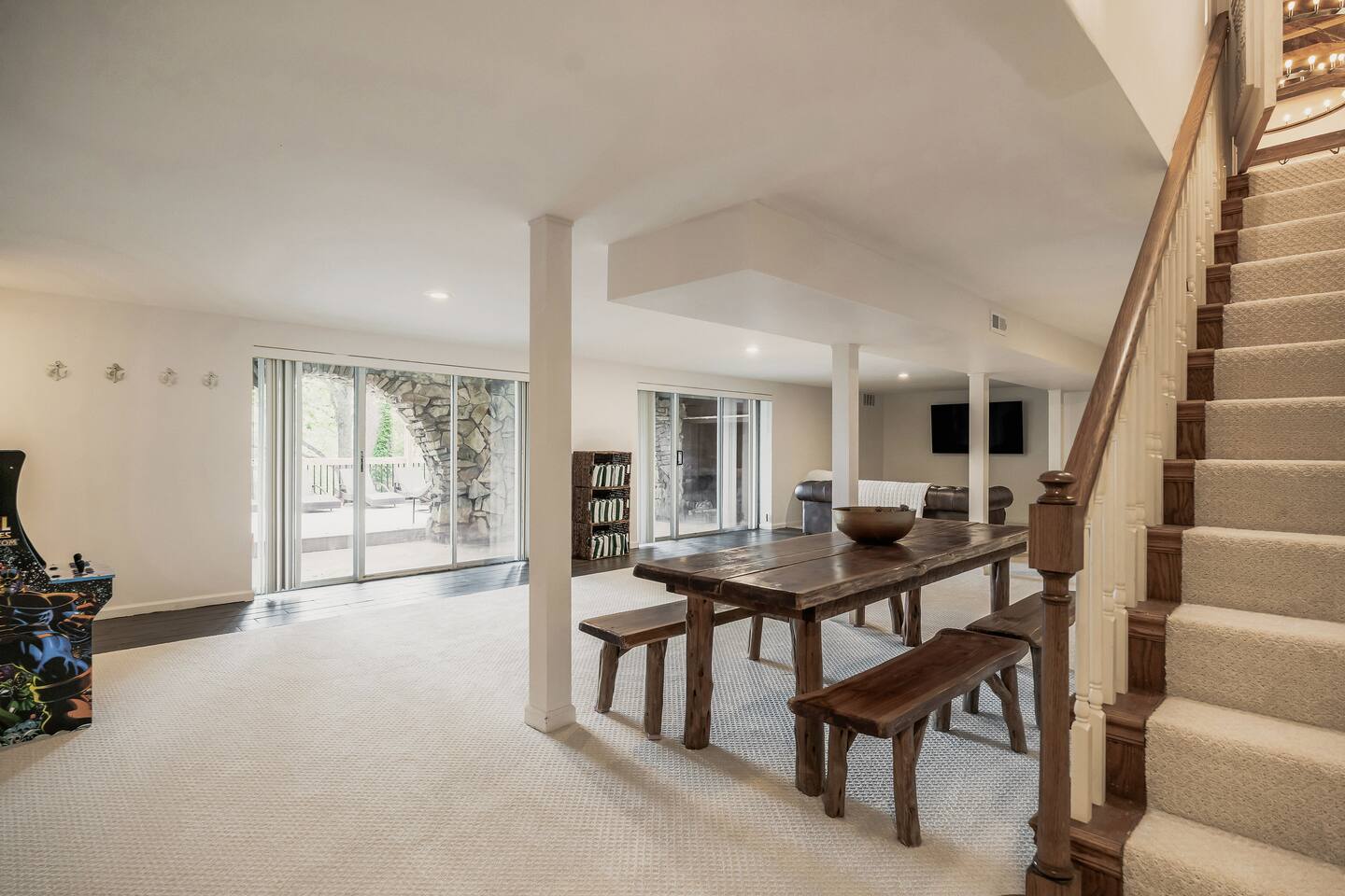 This 7 bedroom 4 bathroom with lower-level rec room is perfect for hosting any size group! The kitchen and lounge areas are a vintage, hip and cozy style!. The outdoor space is spacious and very unique featuring a hot tub, sauna , deck, fire pit, BBQ, and games.